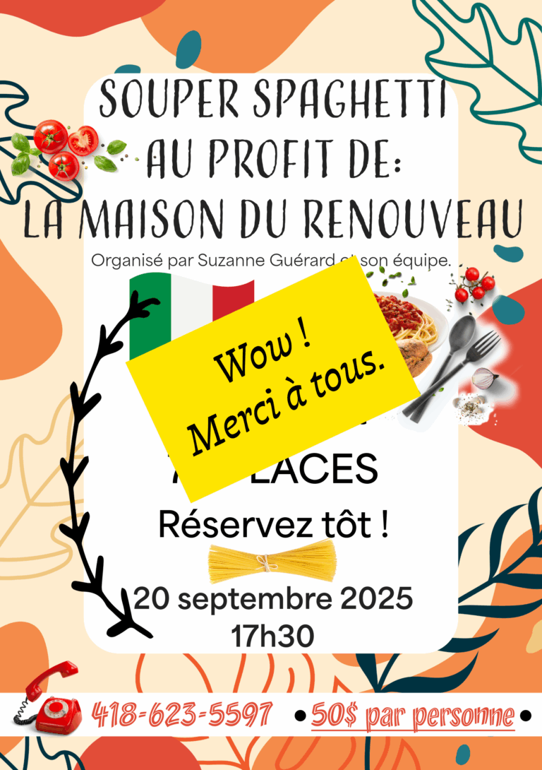 50 $ : Réservez votre place, places limitées, paiement en argent, chèque ou carte de crédit.